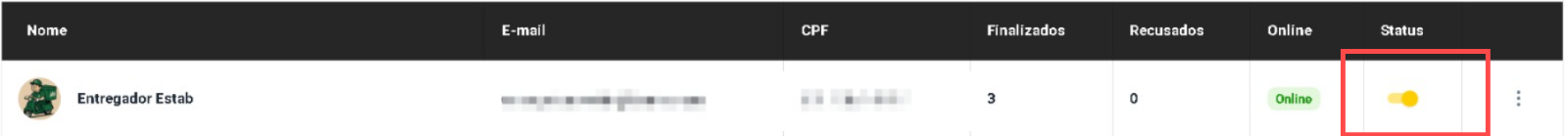 Caso o cadastro já tenha sido aprovado, para que ele possa começar a receber corridas pelo aplicativo, é necessário ativar o status do entregador.