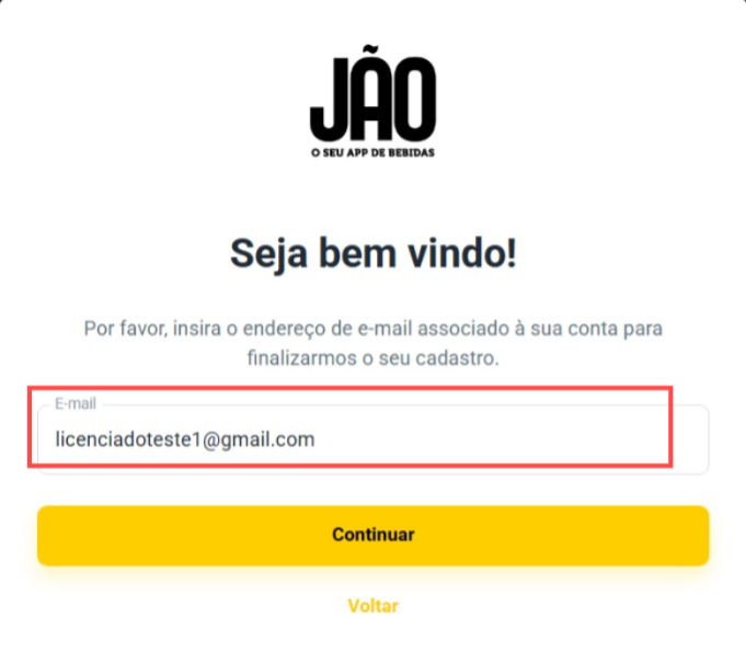Depois, inserir o seu e-mail — o mesmo que você informou à nossa equipe e que foi enviado pra você por e-mail.