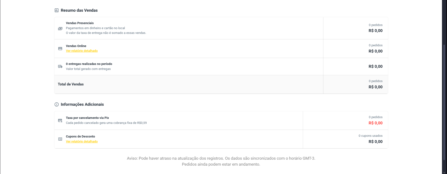 A seção de Resumo das Vendas apresenta a quantidade de pedidos e o valor total transacionado, divididos por tipo de pagamento: