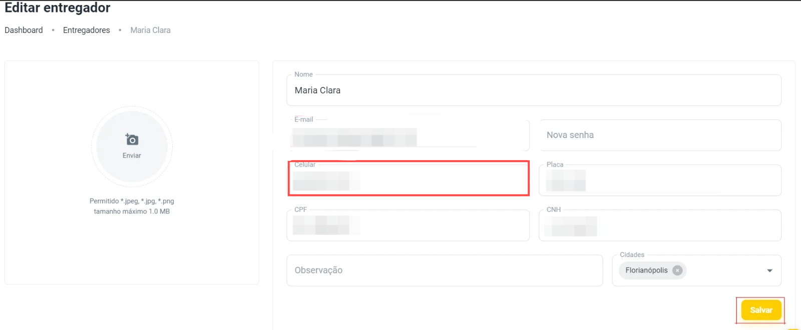 Após identificar o entregador e clicar em Editar, localize o campo Celular.