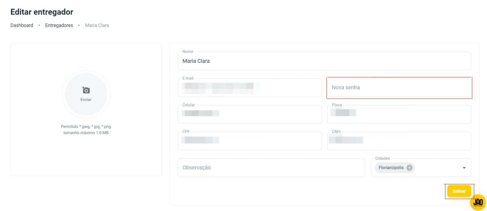 No campo 'Nova Senha', digite a nova senha do entregador e clique em 'Salvar'. Não se esqueça de informar ao entregador sobre a alteração para que ele possa utilizá-la.