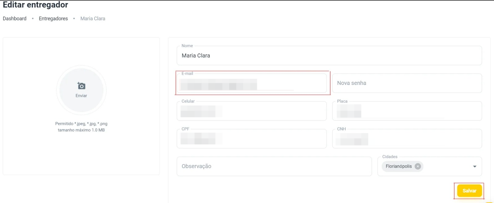 Após identificar o entregador e clicar em 'Editar', como ensinado acima, localize o campo 'E-mail', exclua o e-mail atual e insira o novo. Depois, clique em 'Salvar' para confirmar a alteração.