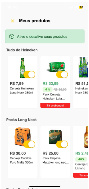 Na aba de Meus Produtos, o lojista tem total controle sobre o inventário da loja. É possível ver todos os itens cadastrados e verificar seus preços. Ao lado de cada produto, há um botão para ativar ou desativar o item da loja. Quando desativado, o produto não aparecerá para os clientes no app.