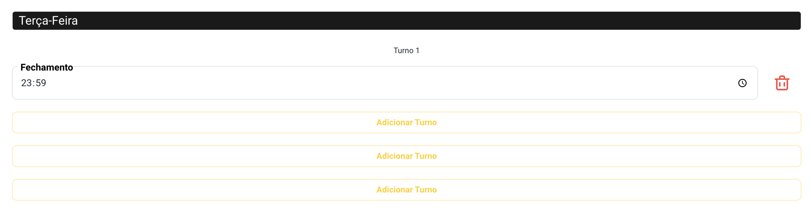 Na tela de horários, coloque o horário de fechamento. Se houver mais turnos, basta clicar em "adicionar turnos".