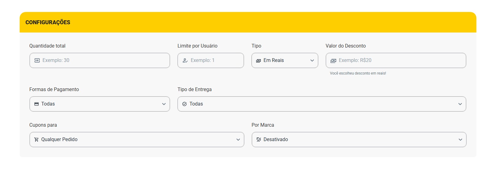 Valor de desconto: Indica o valor do desconto que será aplicado pelo cupom (valor fixo em reais ou percentual).