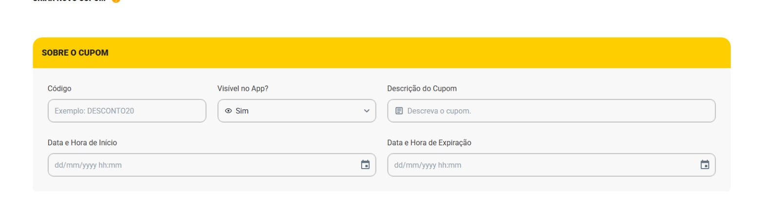 Data e Hora de Início: O dia e a hora em que o cupom começará a ser válido.
