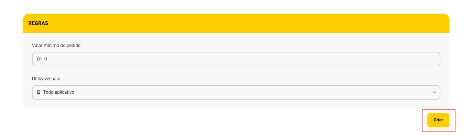 Utilizável para: Define a finalidade do cupom, ou seja, se ele será válido para todo o aplicativo, apenas para a aba de bebidas, ou para a categoria diversos.