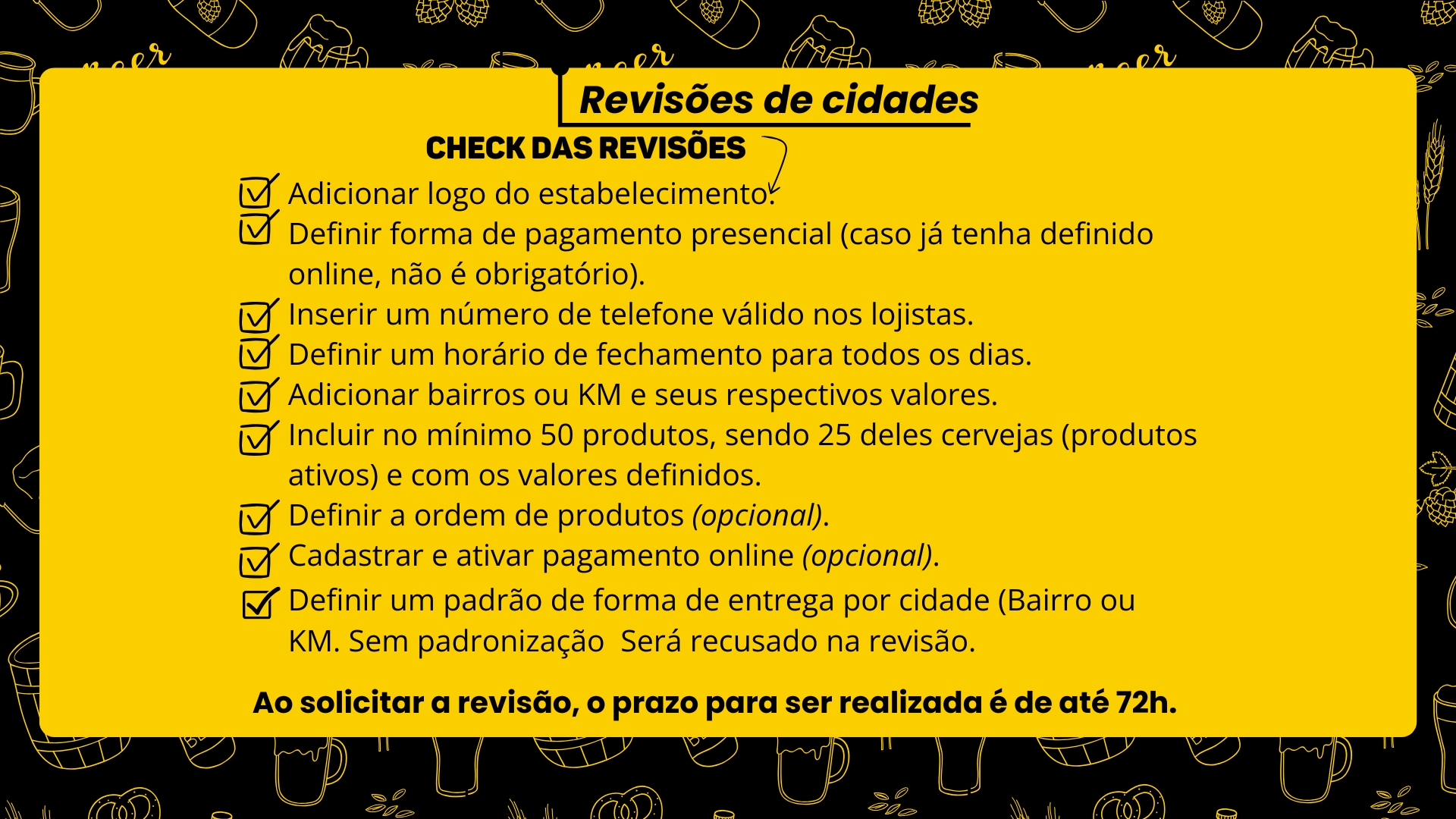 Além disso, todos os estabelecimentos precisam seguir o mesmo padrão de entrega. Por exemplo: se um entrega por bairro, todos os demais também devem estar configurados para entrega por bairro. Isso garante consistência na experiência do cliente e evita confusões na operação.