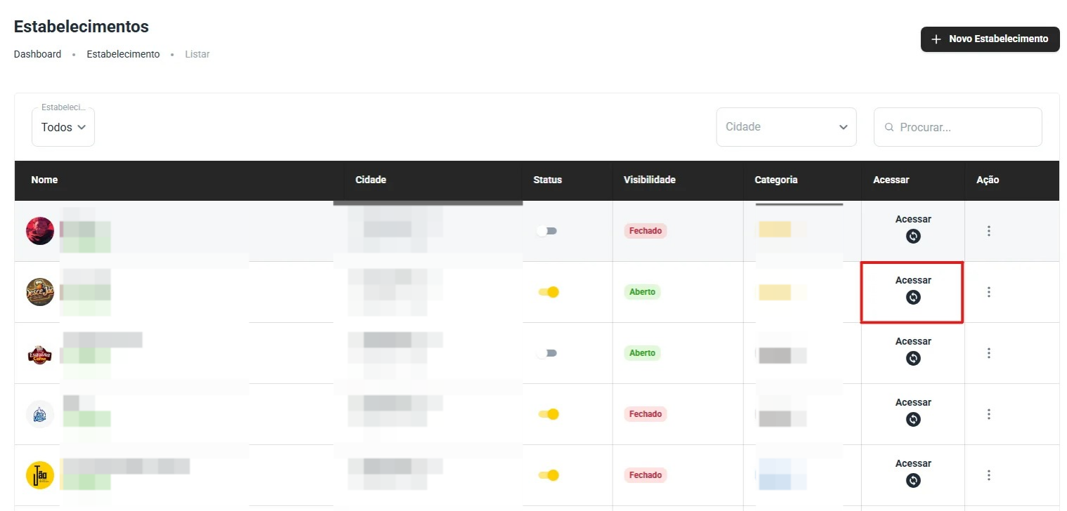 No seu painel de licenciado, acesse o estabelecimento que você deseja verificar, dessa forma abaixo: