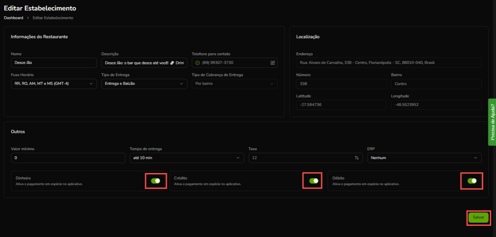 No final da página, você vai encontrar as formas de pagamento. Acione o botão para ativar as que desejar e salve.