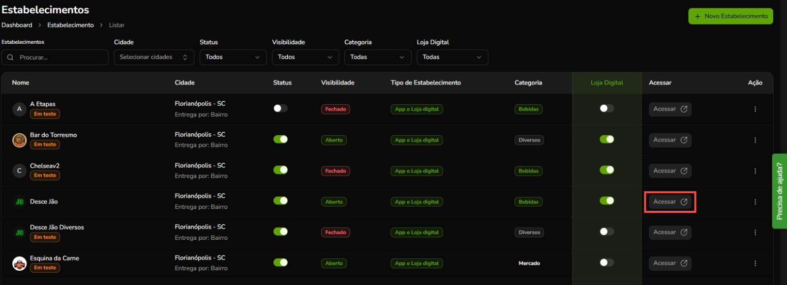 Procure o estabelecimento desejado e acesse-o.