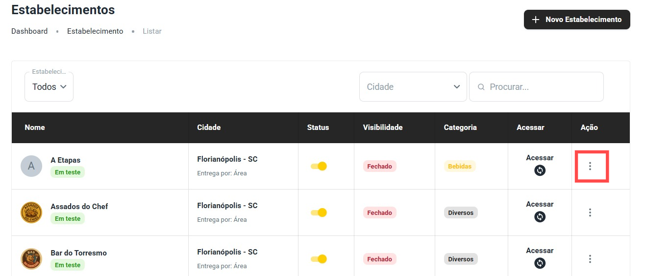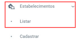 No menu lateral esquerdo, clique em “Estabelecimentos” e depois em “Listar”.