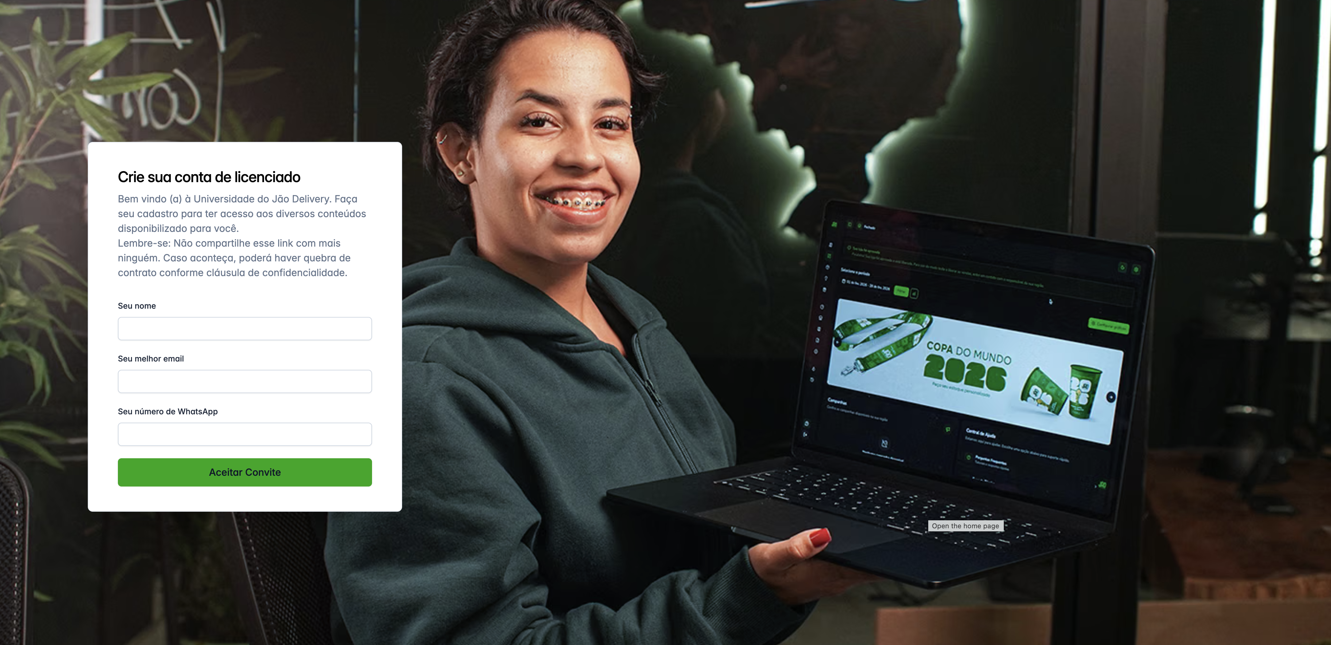 Após receber o link de convite, você será direcionado para essa tela de criar conta de licenciado. Preenche os campos corretamente: