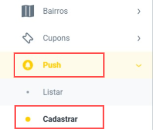 Para enviar seu push, é só seguir estes passos: no seu painel de licenciado, vá até o menu lateral, clique em Push e depois em Cadastrar: