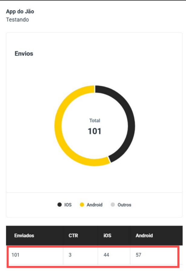 Você poderá visualizar para quantos usuários o push foi enviado e, desses usuários, quais sistemas operacionais eles utilizam (Android ou iOS).