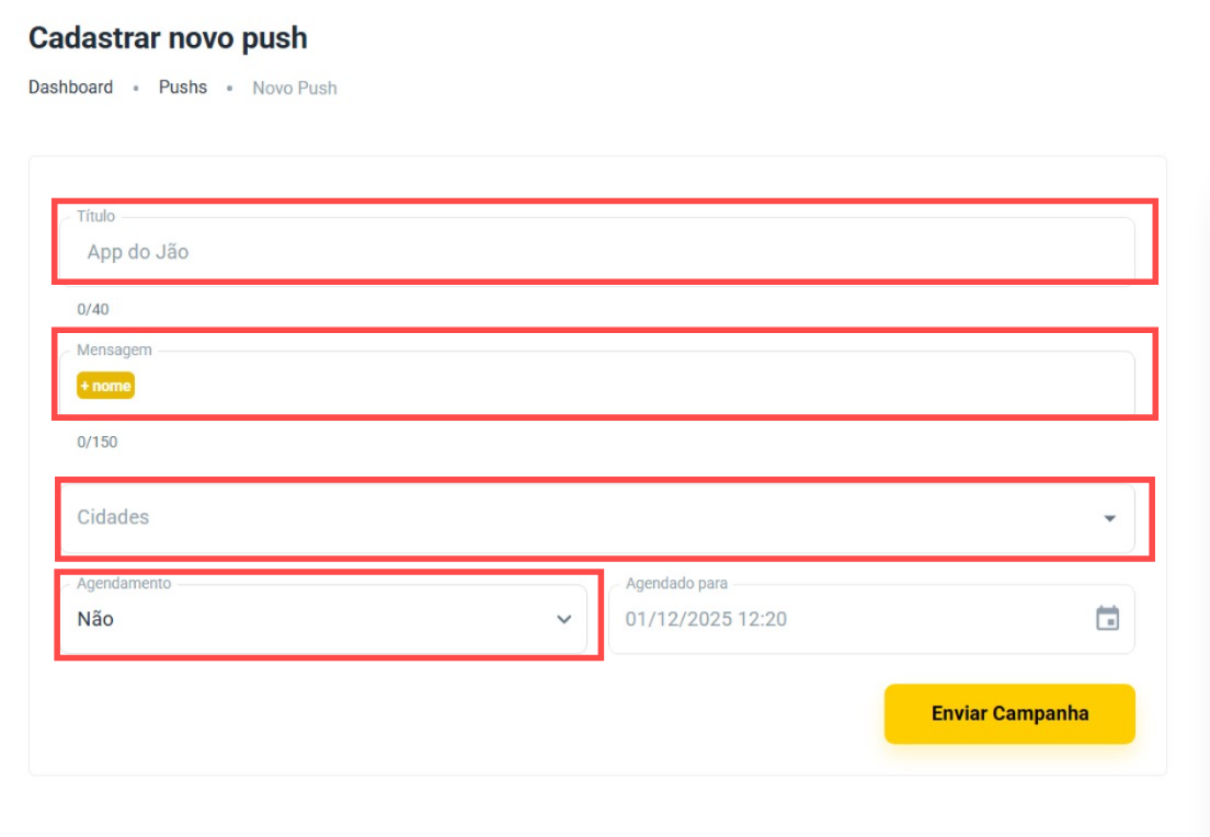 Se escolher “Não”, o push será enviado imediatamente ao clicar em Enviar.