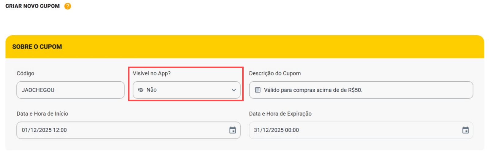 Vamos lĂĄ! Ao criar ou editar um cupom, na opção destacada âVisĂvel no appâ, clique nela e defina como NĂO: