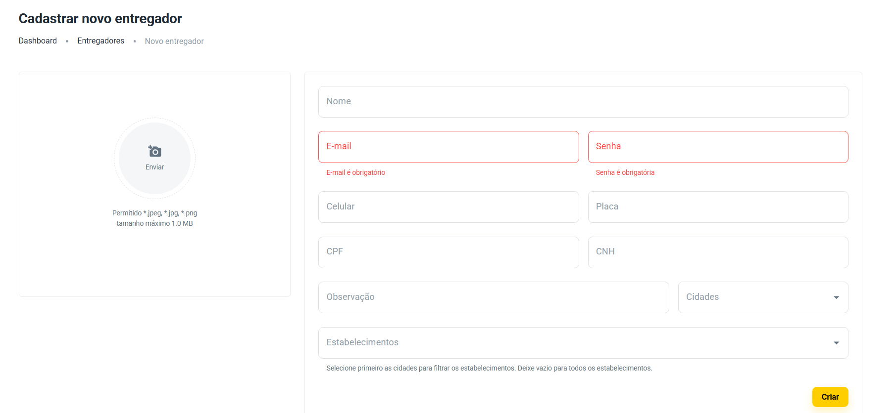 OBS: O campo “Estabelecimento” serve para incluir em quais estabelecimentos o entregador irá trabalhar.