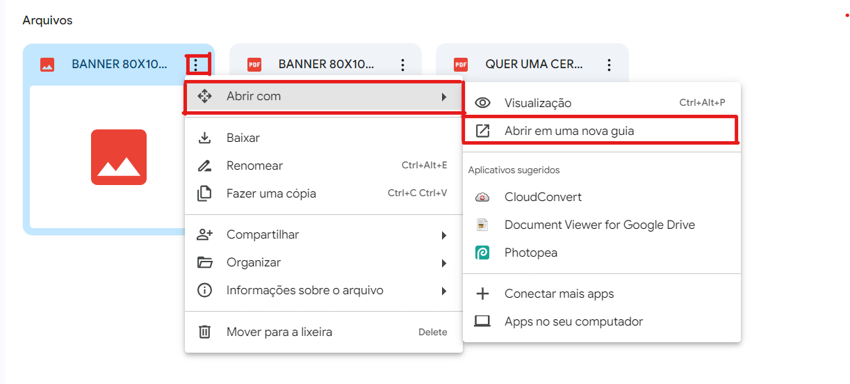 No Google Drive, depois de escolher a imagem desejada, clique nos três pontinhos, selecione “Abrir com” e depois “Abrir em uma nova guia”.