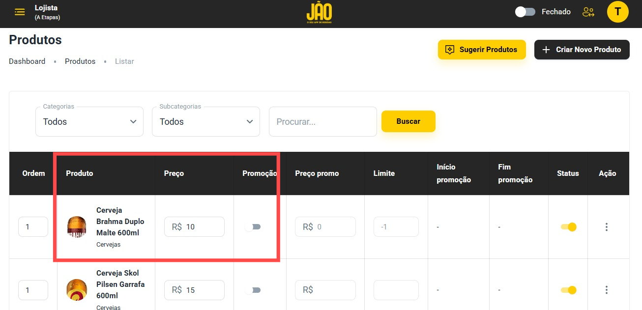 Vá até a aba Produtos.