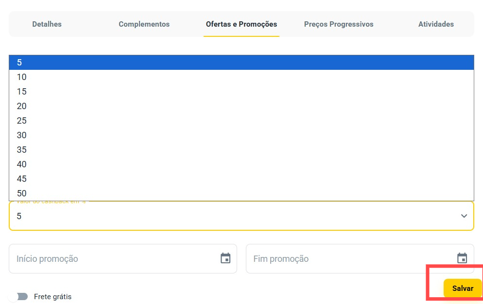 Como configurar? A partir daqui, você irá poder ativar e desativar a função de cashback, além de poder, configurar a porcentagem indo de 5% a 50% e definir as datas em que essa função irá ficar ativada. Após isso, basta clicar em salvar.