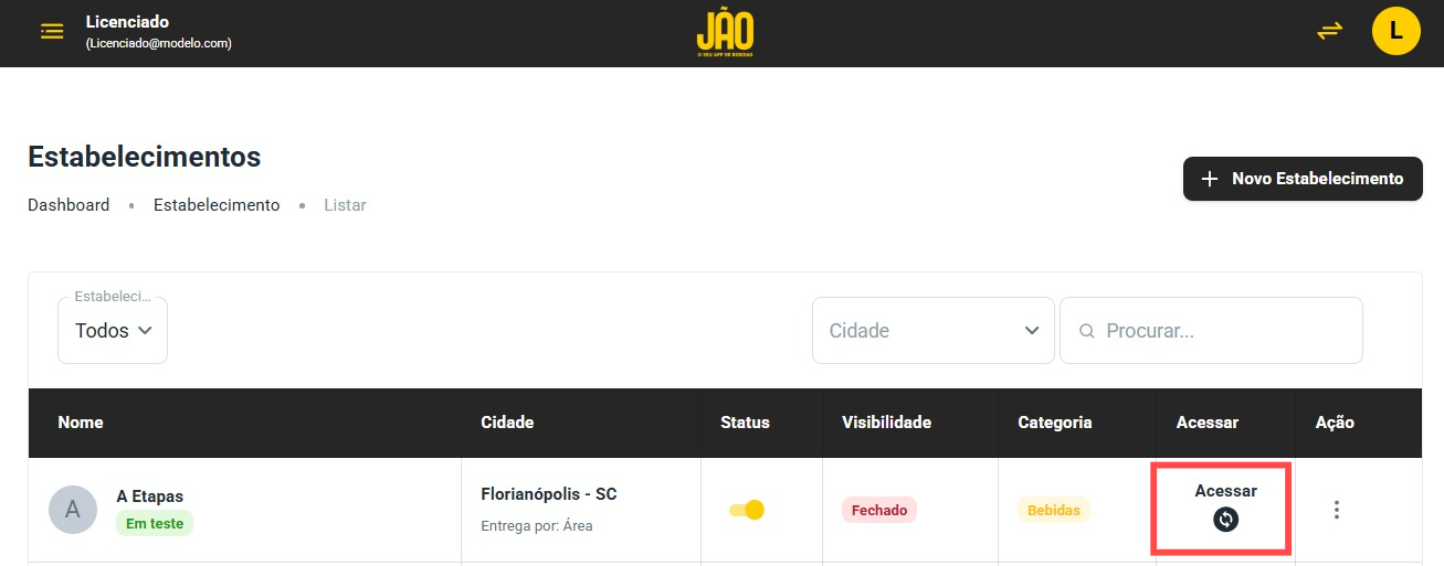 Acesse o painel do lojista usando o acesso de licenciado.
