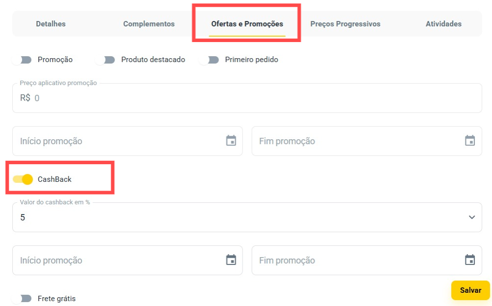 Dentro das opções do produto, você verá o campo Cashback — exatamente como mostrado nas imagens abaixo.