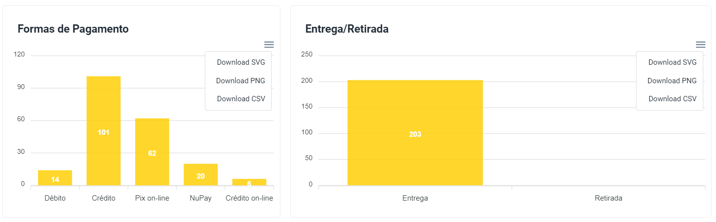 Formas de Pagamento e Entrega/Retiradas é outro gráfico que mede as formas de pagamento mais utilizadas e o tipo de entrega mais frequente durante o período selecionado.