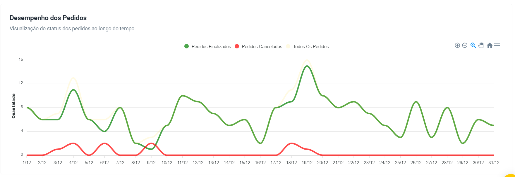 Desempenho dos Pedidos é um gráfico que apresenta os pedidos finalizados, cancelados e o total de pedidos. Ele pode ser usado para analisar e estimar a média de cancelamentos e finalizações, por exemplo.