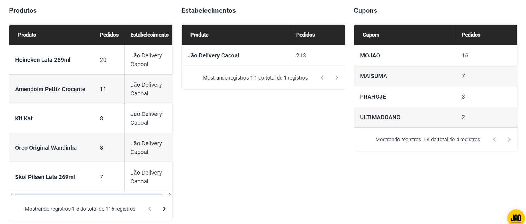 Nesta seção, você encontra os produtos mais pedidos e a quantidade de vezes que foram solicitados. Caso tenha mais de um estabelecimento, é possível identificar qual deles teve mais saída. Ao lado, está o estabelecimento com o maior número de pedidos e a quantidade correspondente, além dos cupons mais utilizados, juntamente com o total.