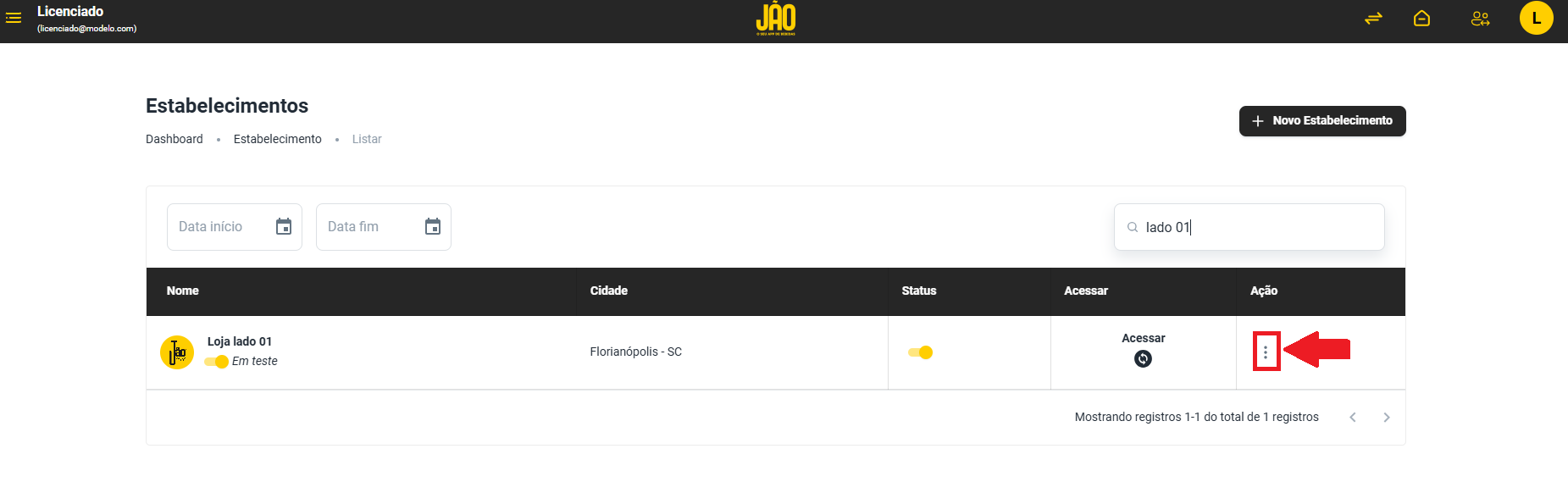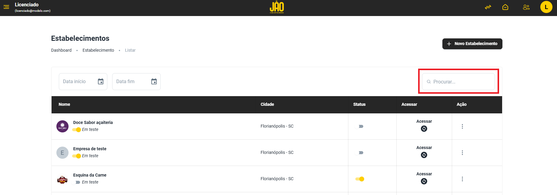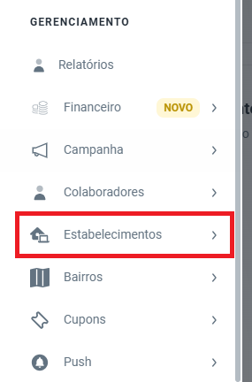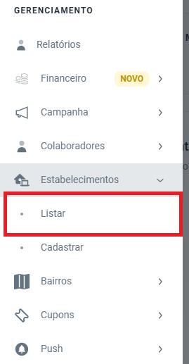 Acessar a lista de estabelecimentos: O primeiro passo é localizar e selecionar o menu estabelecimentos, isso abrirá mais opções e você deve selecionar a opção listar que mostrará todos os estabelecimentos cadastrados.