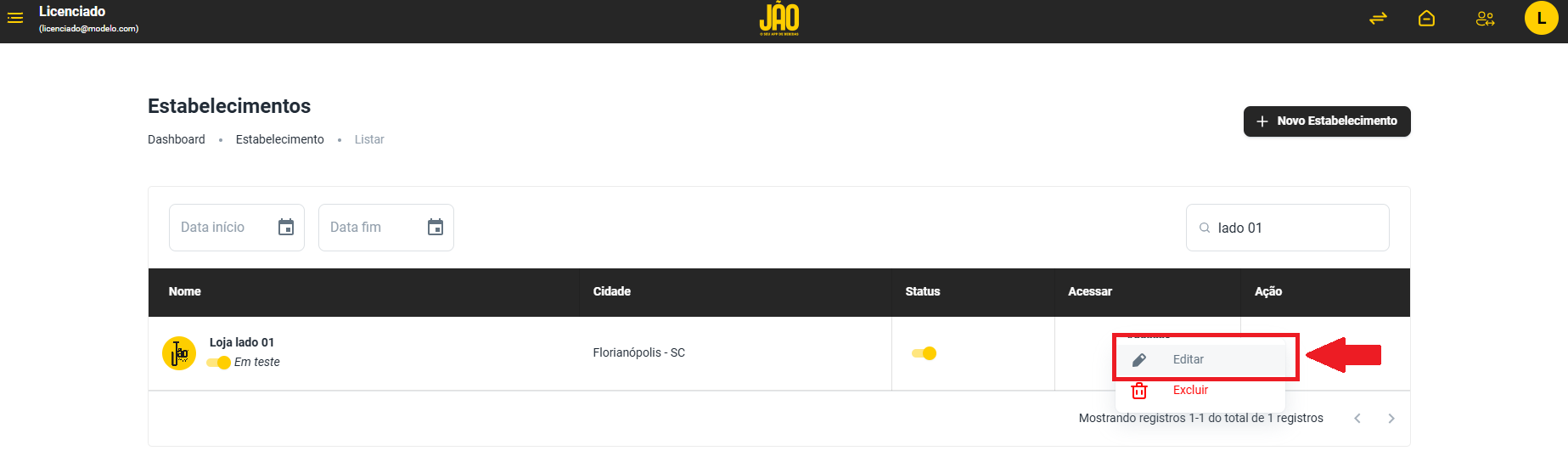 Selecionar a empresa: Após encontrar o estabelecimento desejado, você irá clicar nos 3 pontos, isso irá abrir as opções, então clique em editar. Isso irá te levar a outro menu.